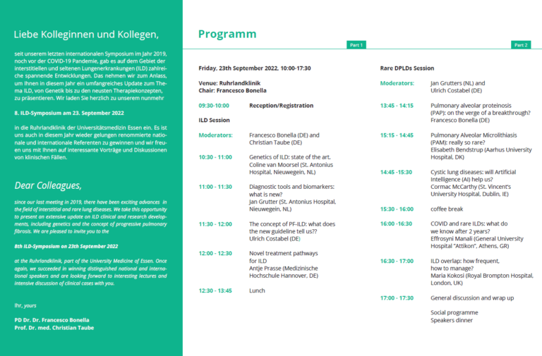 Update zum Thema ILD, von Genetik bis zu den neusten Therapiekonzepten am 23. September 2022 in der Ruhrlandklinik Essen. Nähere Angaben entnehmen sie bitte dem